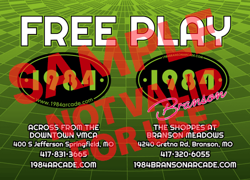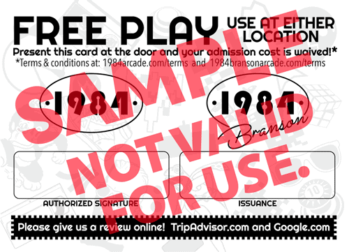 Free Play cards represent a free admission into 1984 during regular business hours.  These cards can be pre-purchased as gift cards or awarded for attaining a high score.  They are also given out as prizes or rewards for other contests and promotions.  Present this card at the door and it will be accepted in lieu of a paid admission.  The cards are turned in and used up.  One use per card.  One person per card.