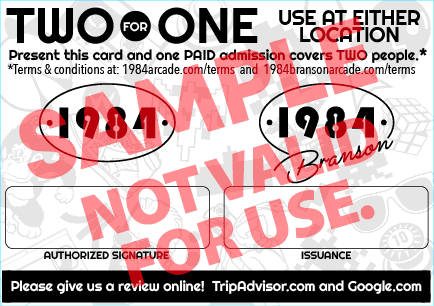 Two for One cards allow two people to enter 1984 for the admission price of one during regular business hours.  These cards are typically given out as promotional items by 1984 staff.  Upon presenting at the door, these cards are turned in and used up.  One use per card.  One Two for One offer per card.
