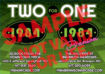 1984 has some specials out there.  Discount coupons, Two for One Offers and Family 4-Packs.  You’ll find them in things like the Campus Coupon Book, Springfield Convention Center and Visitors Bureau, Springfield-Greene Public Library Summer Reading Program.